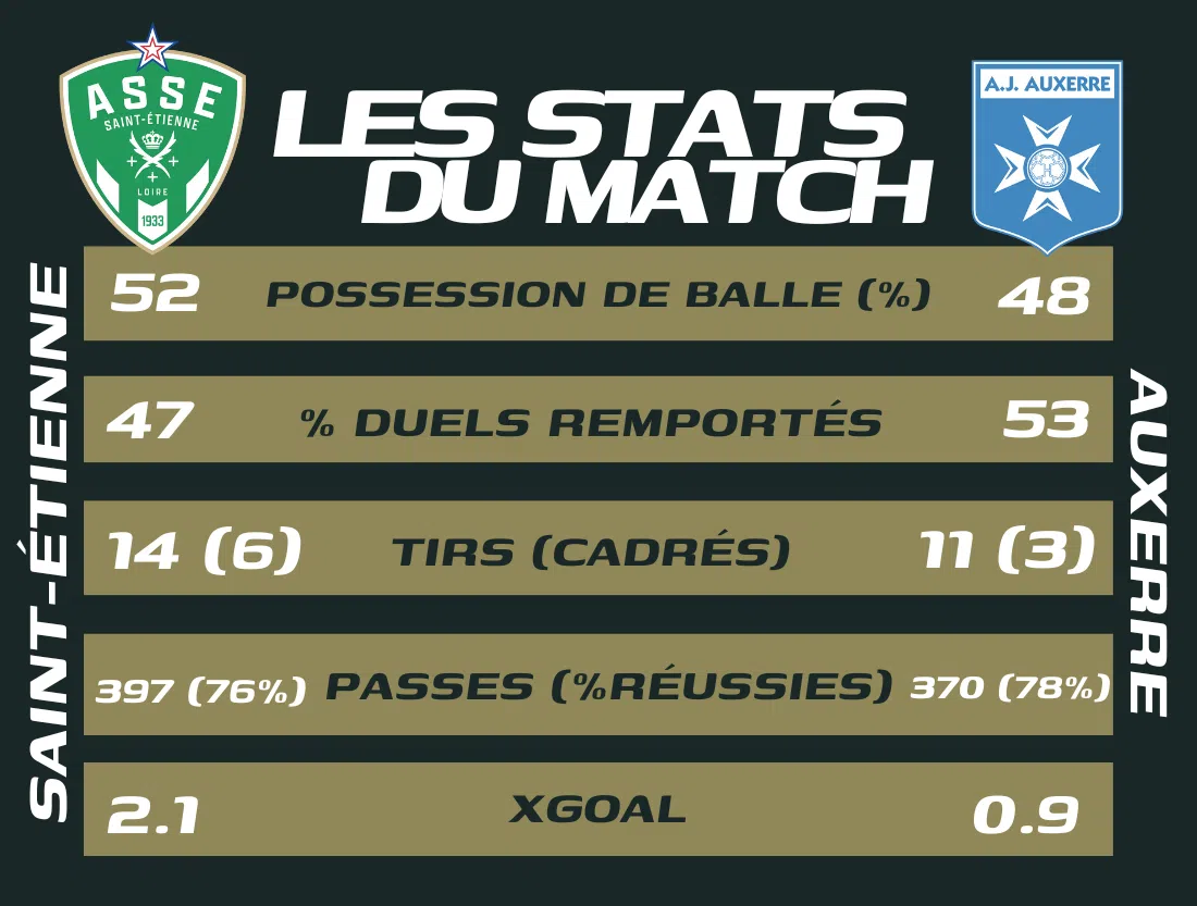 L'AS Saint-Etienne est parvenu à faire chuter le leader auxerrois dans le Chaudron ce samedi. Une victoire enthousiasmante pour la suite de la saison. Retour en chiffres sur ASSE - AJA.