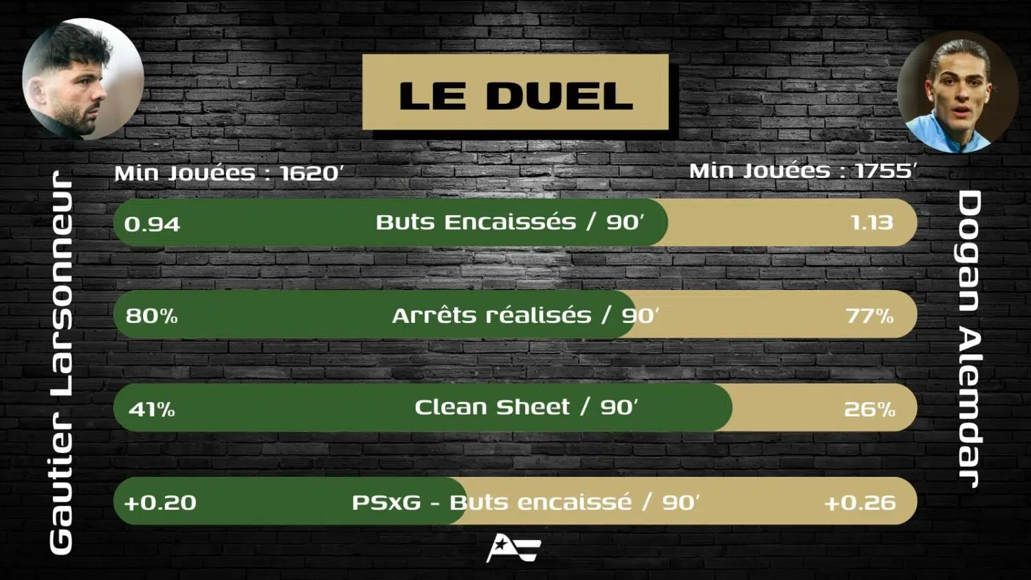Malgré une saison plutôt moyenne des Verts, Gautier Larsonneur n’a encaissé que 13 buts en 18 matchs de championnat contre 22 buts encaissés en 20 rencontres de Ligue 2 pour Dogan Alemdar.