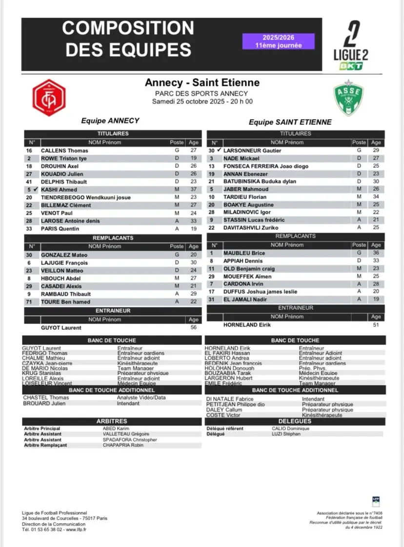 Dans quelques minutes, l’ASSE va disputer une rencontre comptant pour la 11ᵉ journée de Ligue 2 face au FC Annecy. Voici les XI joueurs choisis par Eirik Horneland pour débuter ce soir au Parc des Sports.