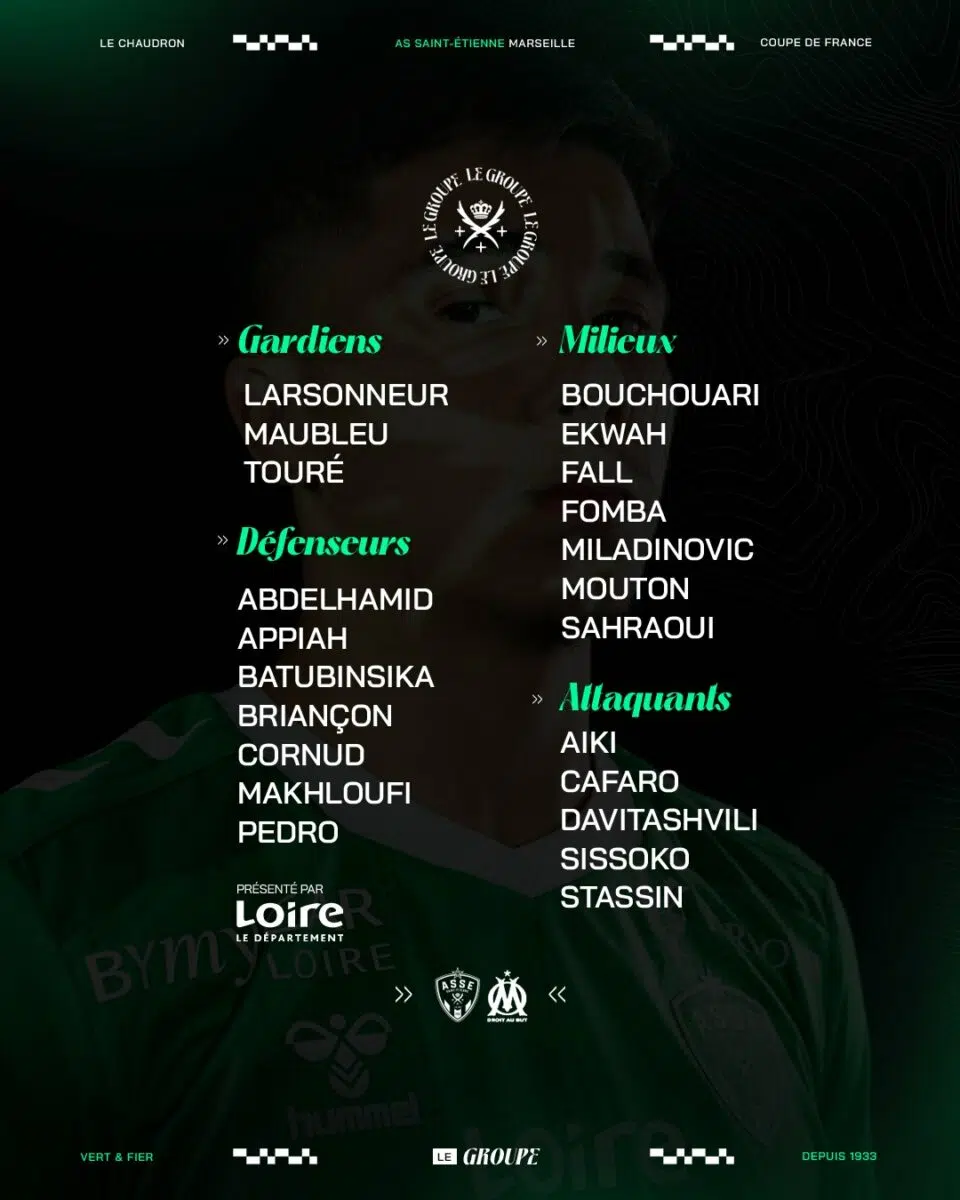Ce dimanche, l'ASSE conclut sa saison par un affrontement en Coupe de France face à l'Olympique de Marseille. Après une série de trois revers consécutifs en Ligue 1, le club a décidé de se séparer d'Olivier Dall’Oglio. Son successeur sera officiellement en place pour la reprise de l'entraînement prévue le 29 décembre. En attendant, c’est Laurent Huard qui assure l’intérim et a choisi le groupe suivant pour cette rencontre.
