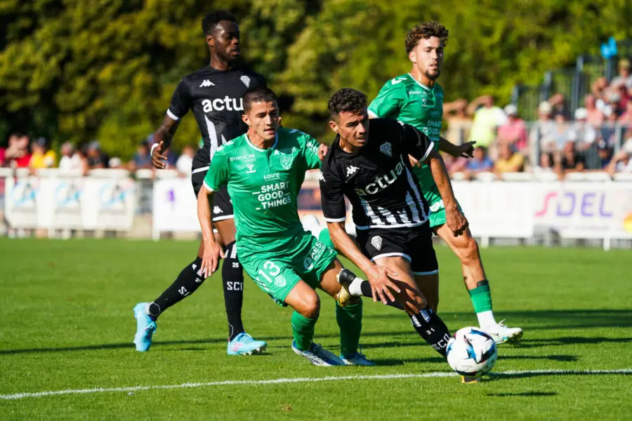 Sergi PALENCIA of Saint Etienne and Ilyes CHETTI of Angers during the friendly match between Angers and Saint Etienne at Stade Raymond Kopa on July 23, 2022 in Angers, France. (Photo by Eddy Lemaistre/Icon Sport)
