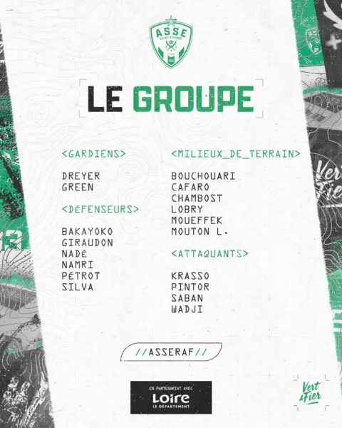 Le match de demain se jouera à 15h au stade Geoffroy-Guichard entre Rodez et Saint-Étienne. Pour l'occasion, le groupe stéphanois a été communiqué par l'entraîneur Laurent Battles, 18 joueurs sont convoqués.