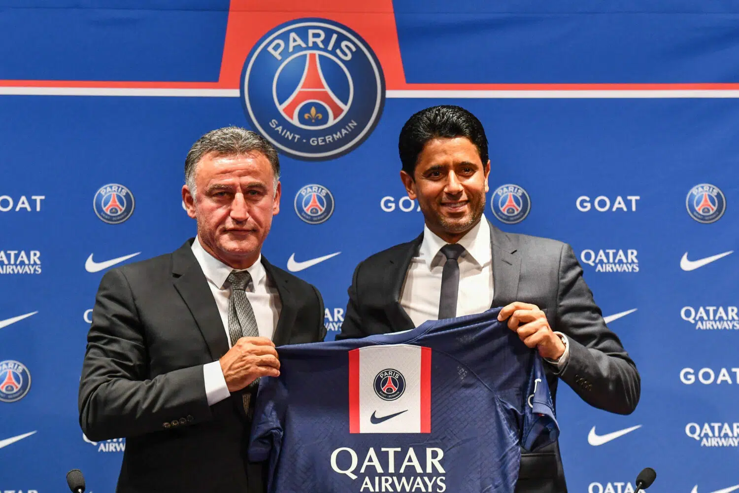 Nasser AL KHELAIFI President of PSG and Christophe GALTIER Head coach of PSG during Paris Saint-Germain Press Conference at Parc des Princes on July 5, 2022 in Paris, France. (Photo by Franco Arland/Icon Sport)