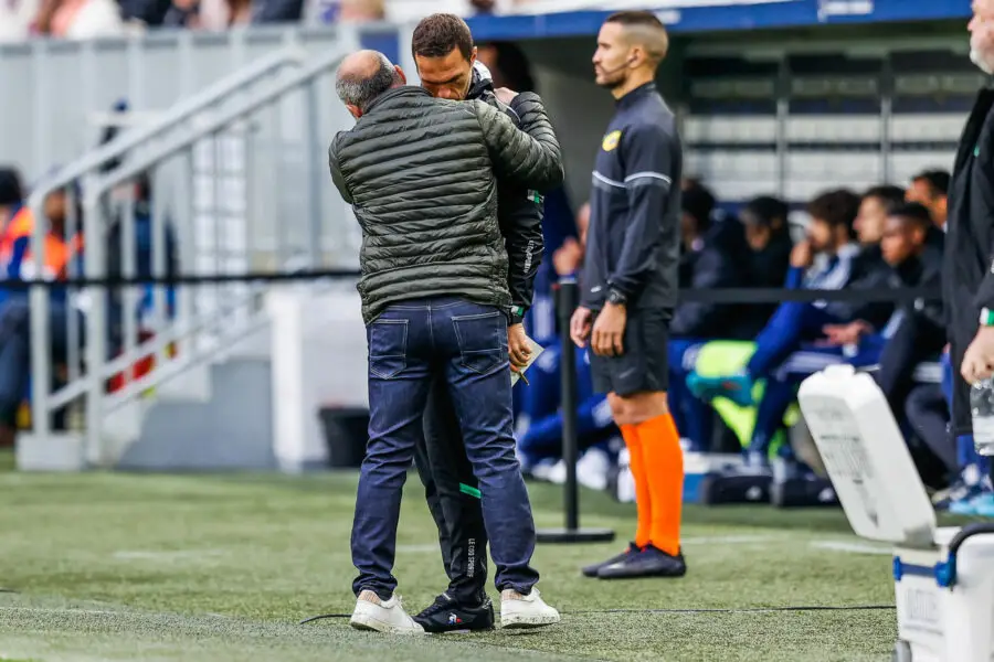 Pascal DUPRAZ head coach and Julien SABLE assistant coach of Saint Etienne during the Ligue 1 Uber Eats match between Bordeaux and Saint-Etienne at Stade Matmut Atlantique on April 20, 2022 in Bordeaux, France. (Photo by Loic Baratoux/Icon Sport)