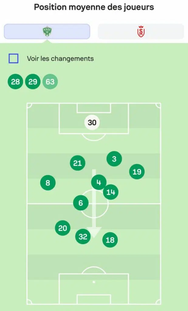 En fin de match, après une interception, les Verts ont montré leur habilité à alterner entre une transition rapide et une phase de possession plus posée. L’équipe a commencé par se projeter vers l'avant, mais face au repli efficace des Rémois, ils ont su calmer le jeu et revenir en arrière. Ce repli tactique a permis d’étendre les lignes adverses et de créer des espaces pour des actions offensives bien construites. Ces phases ont souvent mis en lumière la qualité technique et tactique de l’équipe sous Horneland.