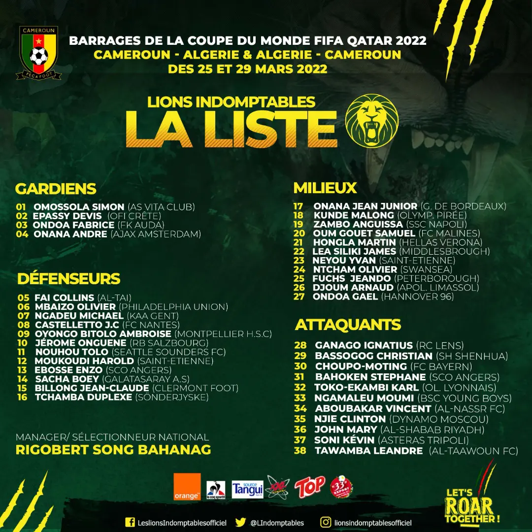 Le Cameroun affrontera l'Algérie dans une confrontation au sommet entre deux équipes africaines très en forme qui joueront leur qualification pour la coupe du monde 2022. Deux stéphanois sont invités à la fête puisque Rigobert Song, nouveau sélectionneur des Lions Indomptables, a fait appel à Yvan Neyou et Harold Moukoudi pour y participer. Une liste de 38 joueurs qui devrait permettre à Song de faire un point sur l'état de ses troupes. S'agissant des stéphanois, il va accueillir deux joueurs en difficulté à St-Etienne. Si Harold Moukoudi est réapparu dans le groupe de Pascal Duprazn Yvan Neyou en semble loin quant à lui. Convoqué avec la réserve ce week-end, il a livré une copie très éloignée de ce qu'il avait montré avec le groupe professionnel sous l'ère Puel...