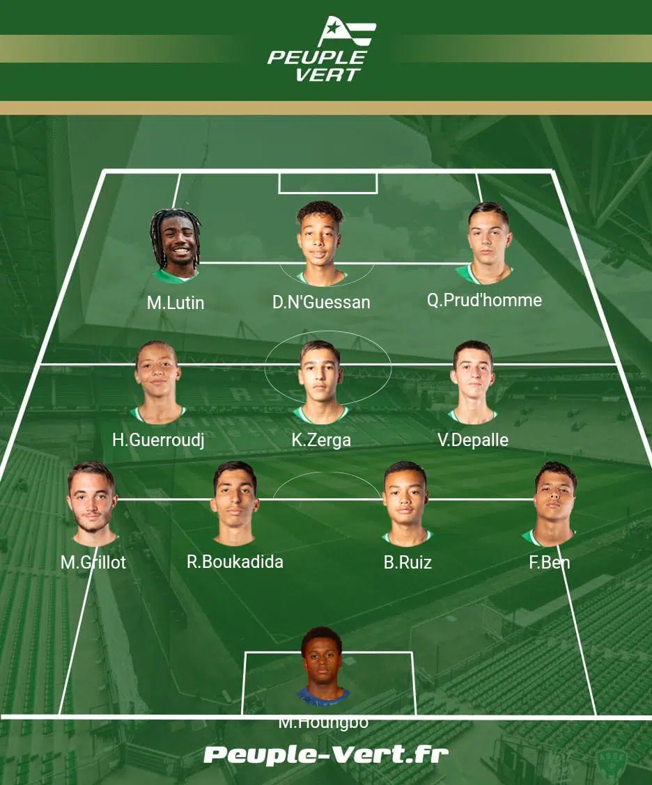 Les Verts maitrisent malgré quelques situations adverses. Malheureusement, l'excellent Rayan Boukadida va voir sa passe en retrait être interceptée par le numéro 9 adverse qui trompe Mateo Houngbo-Civier. 1-1, c'est le score à mi-parcours.