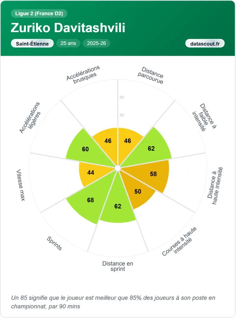 Le radar physique est plus contrasté. Davitashvili n'est pas un athlète de pointe — ses scores en accélérations brusques (46) et légères (46), en vitesse max (44) et en distance en sprint (62) le placent dans la moyenne du championnat. Ce n'est pas un sprinter, pas un joueur de rupture verticale pure.