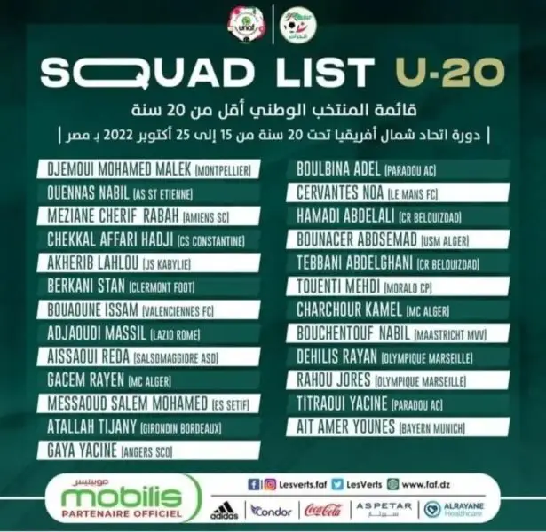 Le sélectionneur national des moins de 20 ans algérien, M. Mohamed LACETTE a communiqué la liste des joueurs retenus pour le Tournoi UNAF U20 qui aura lieu du 15 au 25 octobre au Caire, en Egypte. Parmi celle-ci figure, Nabil Ouennas, le gardien formé au club.