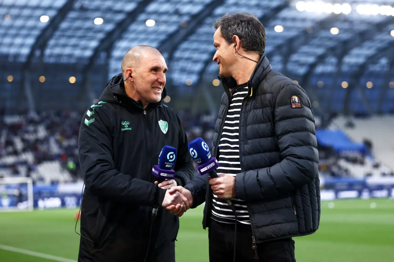 Laurent BATLLES (Entraineur Saint-Etienne ASSE) - Vincent HOGNON (entraineur GRENOBLE GF38) during the Ligue 2 BKT match between Grenoble and Saint-Etienne at Stade des Alpes on April 17, 2023 in Grenoble, France. (Photo by Alex Martin/FEP/Icon Sport)