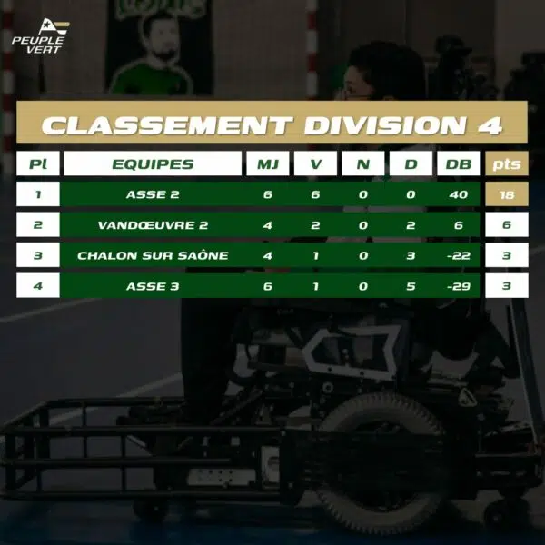 L'objectif est pour le moment très bien respecté pour ASSE Cœur Vert 2 ! 6 victoires en 6 matchs disputés. Les Verts comptent donc 18 points et sont devant Vandœuvre 2 avec ses 6 points mais seulement 4 matchs joués. Chalon se classe 3 ème avec 3 points en 4 matchs. De leur côté les joueurs d'ASSE Cœur Vert 3 qui ont déjà bien progressé comptent 3 points en 6 matchs.