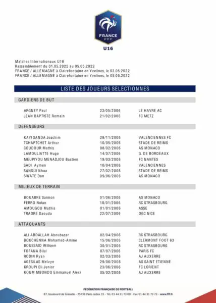 Les deux stéphanois joueront une double confrontation contre leurs homologues allemands. En effet, les oppositions se dérouleront le 3 mai et le 5 mai à Clairefontaine. Le rassemblement se fera du 1er au 5 mai. Nous pouvons légitimement penser que les deux joueurs iront à Clairefontaine le 2 mai puisque les U17 nationaux jouent leur "finale" contre l'AC Ajaccio le dimanche 1er mai pour savoir qui va remporter le championnat cette saison.