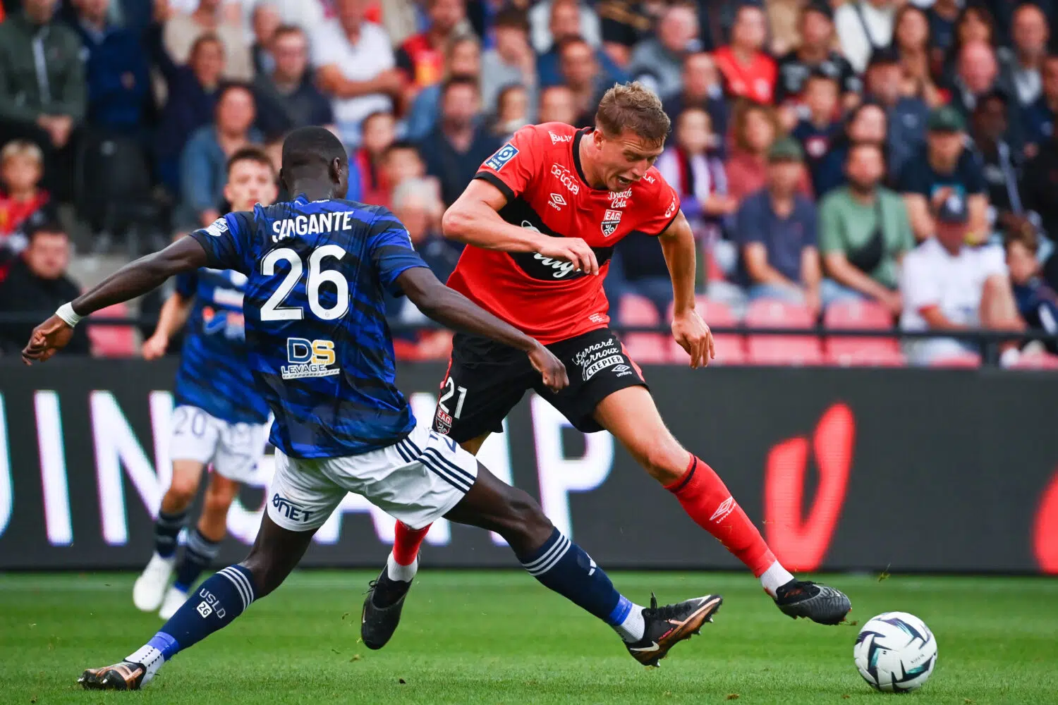 Baptiste GUILLAUME of Guingamp and Opa SANGANTE of Dunkerque during the Ligue 2 BKT match between Guingamp and USL Dunkerque at Stade du Roudourou on August 12, 2023 in Guingamp, France. (Photo by Anthony Dibon/Icon Sport)