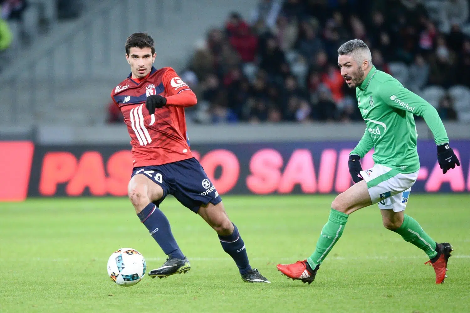 Martin Terrier of Lille Fabien Lemoine of Saint Etienne during the Ligue 1 match between Liile OSC and As Saint Etienne at Stade Pierre-Mauroy on January 13, 2017 in Lille, France. (Photo by Nolwenn L