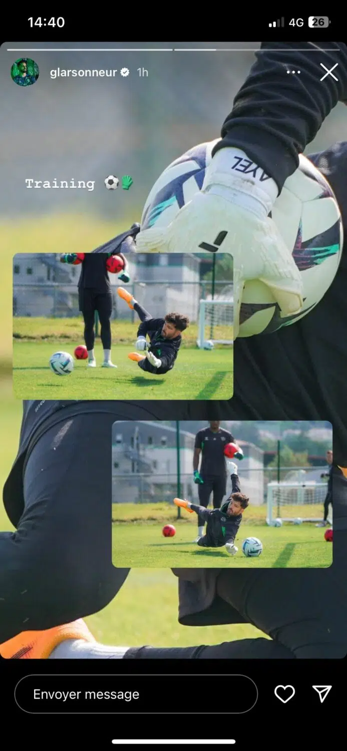 Ce mercredi, Gautier Larsonneur a posté sur son compte instagram une story (ci-dessous). Le portier des Verts enchaîne à l'entraînement. L'espoir de le voir sur la pelouse de Geoffroy-Guichard est évident. Et cette réapparition serait extrêmement bénéfique pour le groupe d'Olivier Dall'Olivier. De quoi pousser à l'optimisme du côté de l'ASSE ?