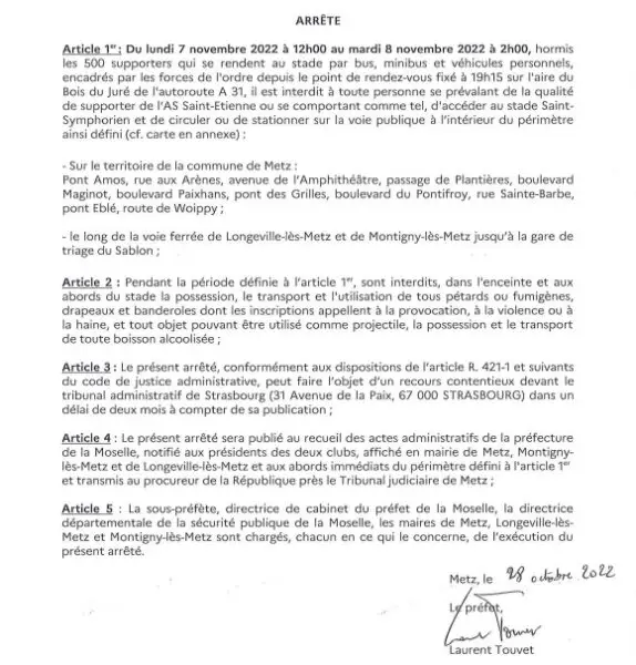 L'arrêté de la préfecture pour Metz-ASSE
