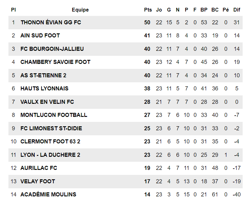 La réserve retrouve sa position de dauphin derrière le futur pensionnaire de national 2 : Thonon Evian Grand Genève. Il reste 4 matchs pour bien clôturer la saison. Razik Nedder aura probablement pour objectif de faire finir cette équipe sur le podium. Aussi, il voudra continuer à préparer l'année prochaine en donnant du temps de jeu à des jeunes joueurs (Gauthier, Othman).