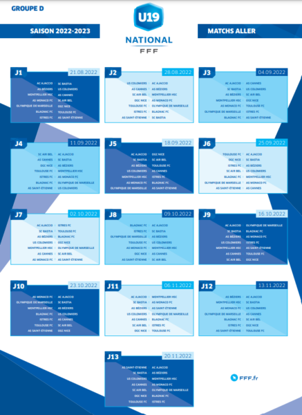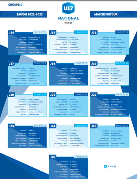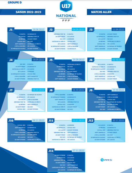 Les U17 commenceront fort avec un déplacement à l'Olympique de Valence avant la réception de l'AS Monaco pour la seconde journée de championnat. Un premier gros test ! La poule s'annonce difficile avec des déplacements périlleux en Corse ou dans le sud de la France. Des matchs très formateurs pour la génération 2006-2007 !