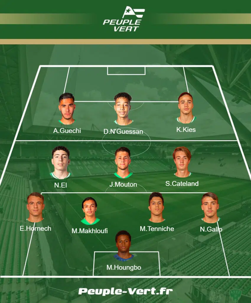 La première mi-temps a mis du temps à se lancer. Néanmoins, c'est à la 40ᵉ minute de jeu que le U16 Djylian Nguessan déborde et centre pour Guechi qui ouvre le score dans cette rencontre et trompe la vigilance d'un certain Valentin Cenatiempo ayant relâché le ballon suite au centre. Ce gardien portait le maillot de l'ASSE la saison dernière. Le score à la mi-temps est de 1-0 et les Verts en bonne posture dans cette rencontre.