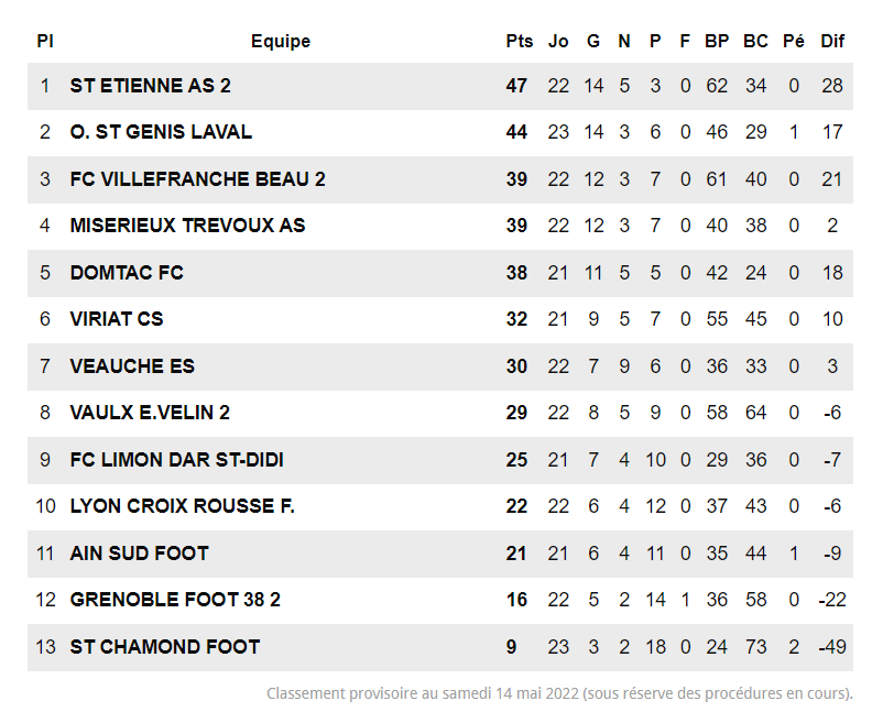 A deux journées de la fin, les stéphanois ont désormais besoin d'un petit point pour valider mathématiquement leur accession. Leurs poursuivants, Saint-Genis-Laval et DOMTAC sont les dernières équipes à pouvoir empêcher les verts d'obtenir le sacre. Il faudra aller chercher ce point manquant soit contre Lyon Croix Rousse, soit contre Limonest lors des deux derniers matchs ! Force aux jeunes pour finir le travail avec brio.