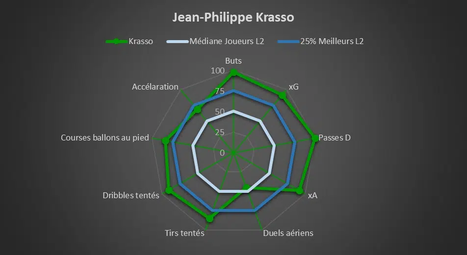 Jean-Philippe Krasso est en train de réaliser une saison absolument fantastique. Avec 16 buts et 9 passes décisives (impliqué sur 25 sur les 51 marqués), il est quasiment impliqué sur un but sur deux. Cela fait de lui, le joueur phare de cet effectif. De ce fait, nous vous posons la question : est-il le meilleur joueur de ligue 2 ?