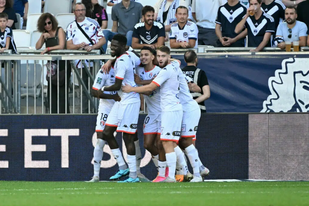 15 Pape Djibril DIAW (slmfc) - 20 Amin CHERNI (slmfc) - 22 Titouan THOMAS (slmfc) during the Ligue 2 BKT match between Football Club des Girondins de Bordeaux and Stade Lavallois Mayenne Football Club at Stade Matmut Atlantique on October 7, 2023 in Bordeaux, France. (Photo by Christophe Saidi/FEP/Icon Sport)