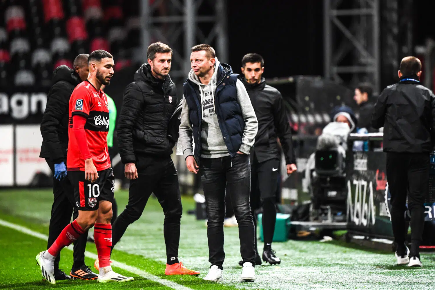 Mehdi MERGHEM leave the pitch injured and Stephane DUMONT head coach of Guingamp during the Ligue 2 BKT match between En Avant de Guingamp and Association de la Jeunesse Auxerroise at Stade du Roudourou on November 6, 2023 in Guingamp, France. (Photo by Anthony Bibard/FEP/Icon Sport)