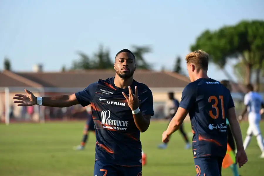 Arnaud NORDIN of Montpellier celebrates his scoring during the friendly match between Toulouse and Montpellier on July 23, 2022 in Agde, France. (Photo by Alexandre Dimou/Icon Sport)