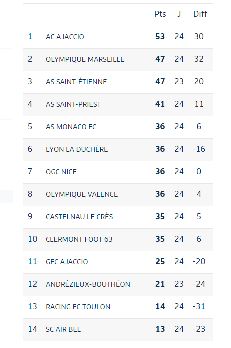 Les verts ont donc 50 points et repassent devant l'Olympique de Marseille. Il reste deux matchs aux hommes de Moreau pour aller chercher cette première place. L'AC Ajaccio et le Racing Toulon seront les deux derniers adverses. Pour Ajaccio, il faudra affronter l'AS Saint-Etienne et l'AS Saint-Priest. Le suspense est à son comble !