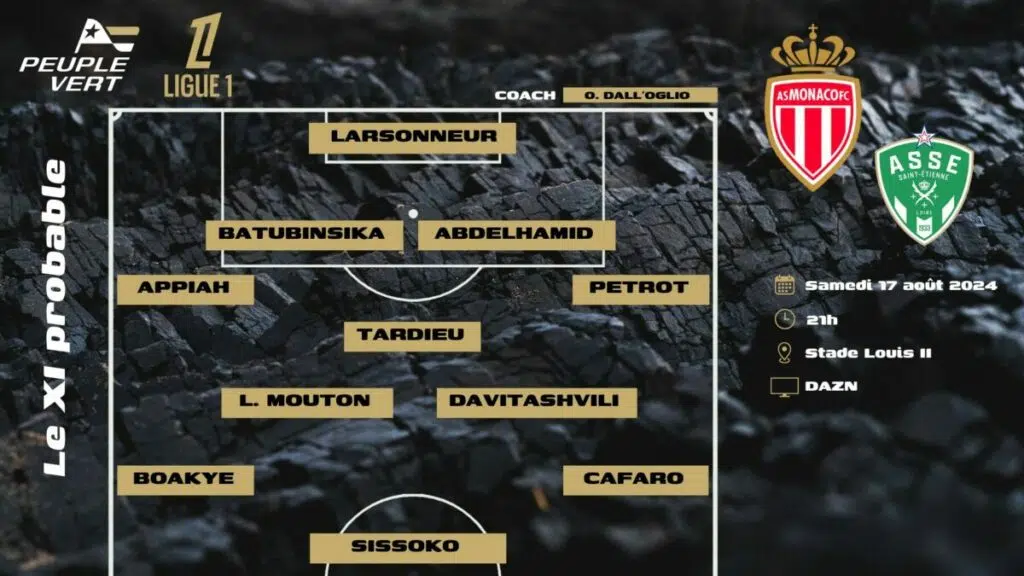 Le milieu de terrain est également un secteur qui va donner du fil à retordre à ODO avant d'affronter Monaco. Moueffek out, il va falloir composer sans le précieux box to box. Pour le suppléer, Monconduit, Mouton, Fomba, Gauthier... Si la volonté du coach est de mettre en place de joueurs rompus à la Ligue 1 et déjà intégrés au système, Thomas Monconduit fait figure de favori pour évoluer devant la sentinelle du milieu qui devrait être Tardieu. Toutefois, la belle préparation de Louis Mouton pourrait également lui permettre de prendre une place de titulaire dans l'entre-jeu. Aux côtés de l'ancien pallois, Zuriko Davitashvili devrait être titularisé afin d'apporter sa technique, sa vision et du soutien à l'attaque stéphanoise.