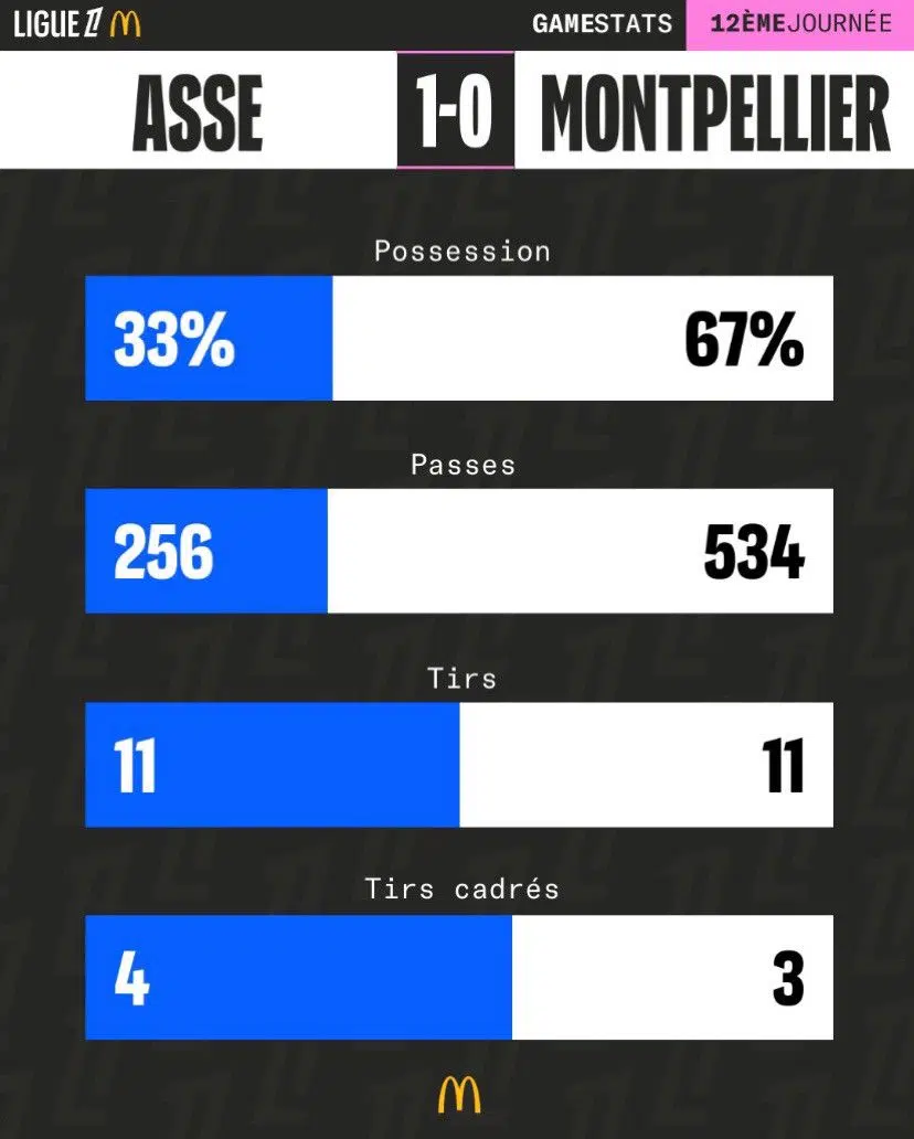 Au terme d’une rencontre disputée, l’AS Saint-Étienne a décroché une courte mais précieuse victoire 1-0 contre Montpellier lors de la 12e journée de Ligue 1. Si le score est flatteur, les statistiques révèlent un match où les Verts ont été dominés dans la possession et ont su maximiser leurs rares opportunités.