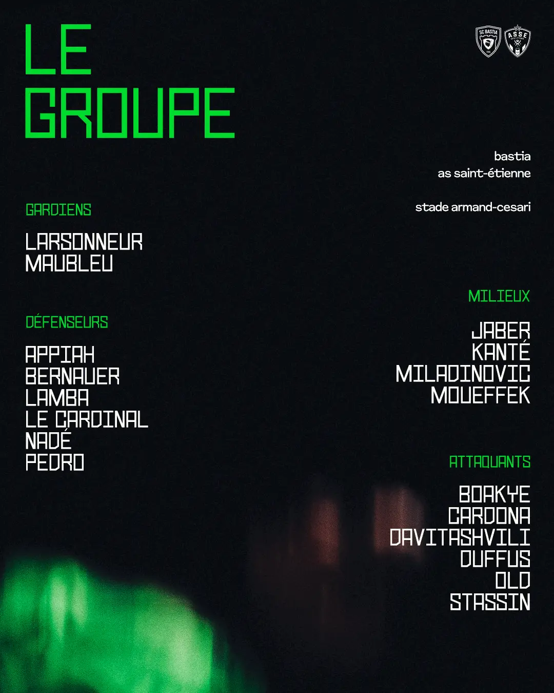 Ce samedi soir, l'ASSE ira défier Bastia à Furiani, lors de la 31ᵉ journée de Ligue 2. Voici le groupe choisi de Philippe Montanier :