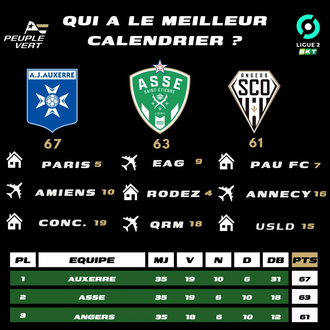 Si l'on s'intéresse au calendrier d'Auxerre, d'Angers et de Saint-Etienne, on remarque que les deux concurrents des Verts jouent deux fois à domicile et une fois à l'extérieur. Pour l'ASSE, c'est le contraire. Les Stéphanois termineront loin de leurs terres, du côté de QRM.