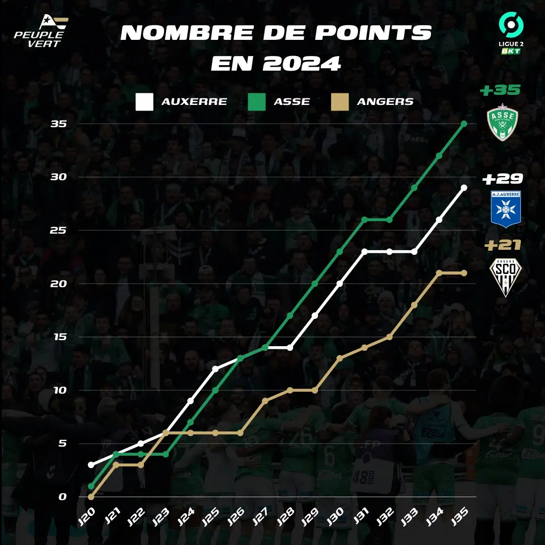 Des statistiques impressionnantes qui font la force de l'ASSE. Durant le mercato hivernal, les arrivées d'Irvin Cardona, de Nathanaël Mbuku et le retour d'Yvann Maçon ont grandement contribué au renouveau stéphanois. Au classement de 2024, l'ASSE caracole en tête avec 35 points pris. Loin devant Auxerre 29 et surtout Angers 21, qui est seulement 11e de Ligue 2.