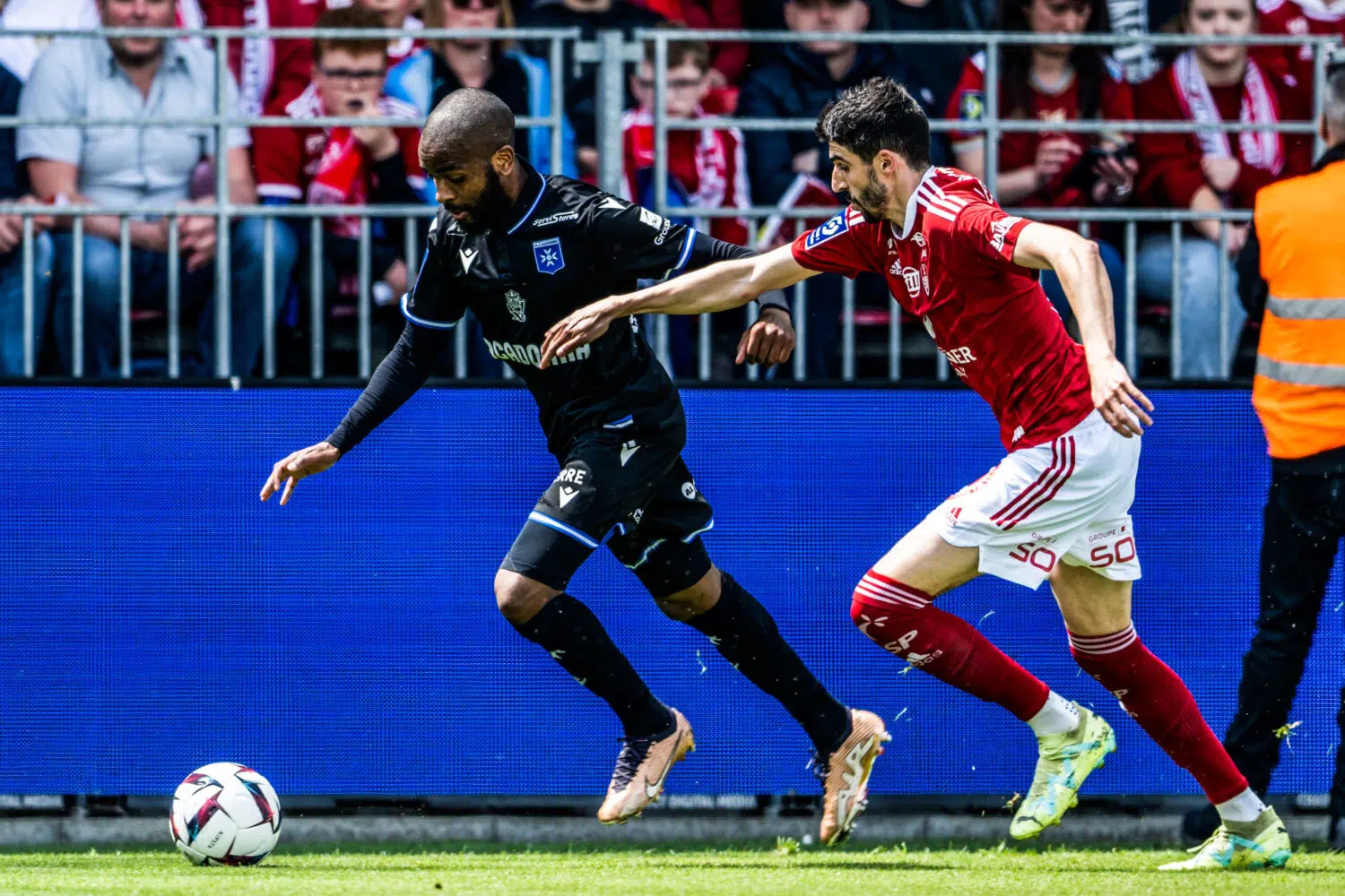 Youssouf M'CHANGAMA of Auxerre and Pierre LEES-MELOU of Brest during the Ligue 1 Uber Eats match between Brest and Auxerre at Stade Francis Le Ble on May 14, 2023 in Brest, France. (Photo by Ombeline Eppe/Icon Sport)
