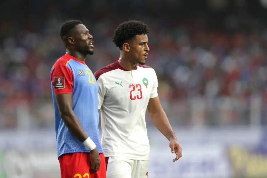 Chancel Mbemba of DR Congo and Rayan Mmaee A Nwambeben of Morocco during the Qatar 2022 FIFA World Cup qualifier between DR Congo and Morocco held at the Pentecost Martyrs Stadium in Kinshasa, DR Congo on 25 March 2022 © Imad Attalal/Sports Inc - Photo by Icon sport