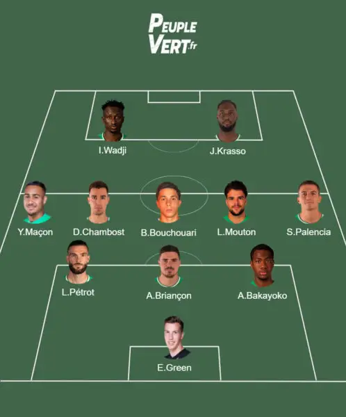 Alors que JP Krasso est en confiance ces derniers matchs, il sera titularisé pour continuer à soigner ses statistiques cette saison. Cette fois-ci, il sera accompagné d'Ibrahima Wadji. La nouvelle recrue sénégalaise va apporter toute sa vitesse et une profondeur qui manque terriblement à l'ASSE. L'attaquant remplacera numériquement Mathieu Cafaro, à moins que Cafaro soit titularisé au milieu à la place de Louis Mouton (lui aussi sous la menace d'une suspension).