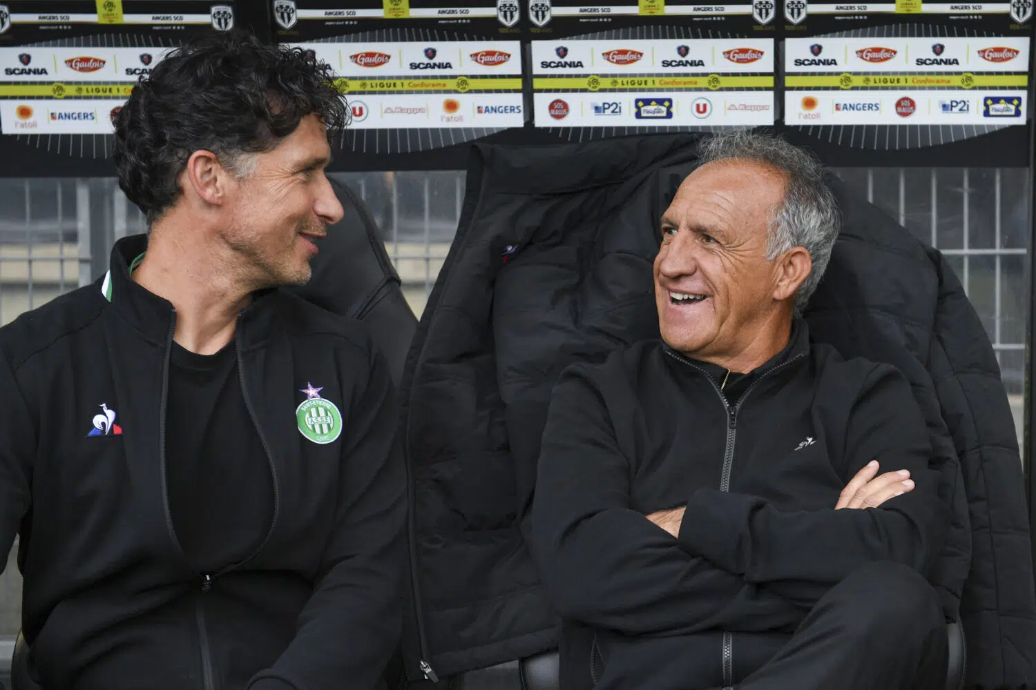 Assistant coach Laurent HUARD and head coach Ghislain PRINTANT of St Etienne during the Ligue 1 match between Angers and Saint Etienne on September 22, 2019 in Angers, France. (Photo by Aude Alcover/Icon Sport)