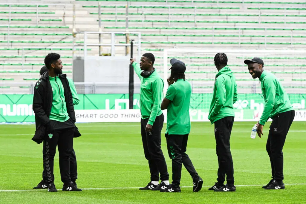Players of Saint Etienne during the Ligue 2 BKT match between Saint Etienne and Quevilly Rouen Metropole at Stade Geoffroy-Guichard on May 20, 2023 in Saint-Etienne, France. (Photo by Daniel Derajinski/Icon Sport)