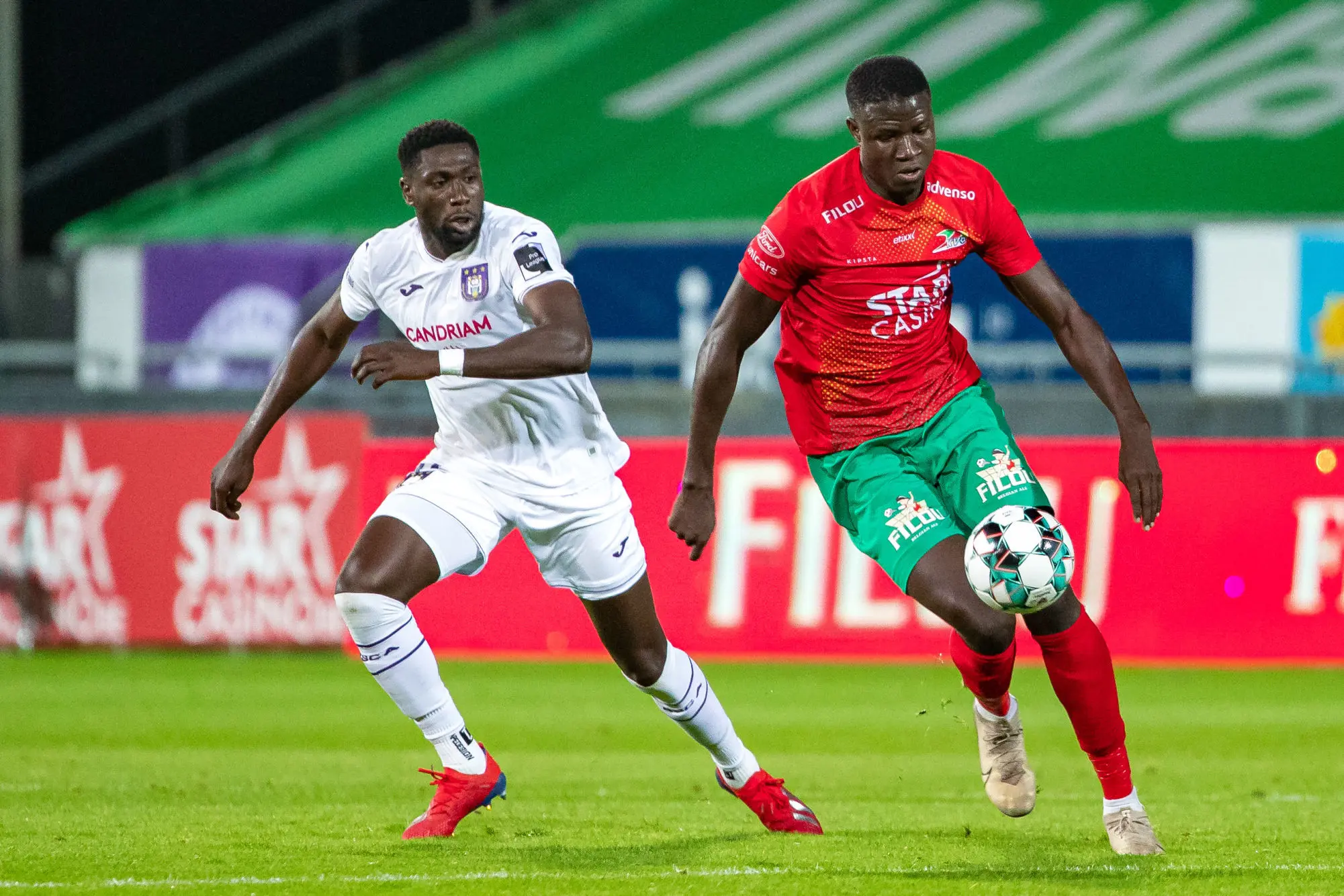 Anderlecht's Derrick Luckassen and Oostende's Makhtar Gueye fight for the ball during a soccer match between KV Oostende and RSC Anderlecht, Friday 28 August 2020 in Oostende, on day 4 of the 'Jupiler Pro League' first division of the Belgian championship. BELGA PHOTO KURT DESPLENTER
