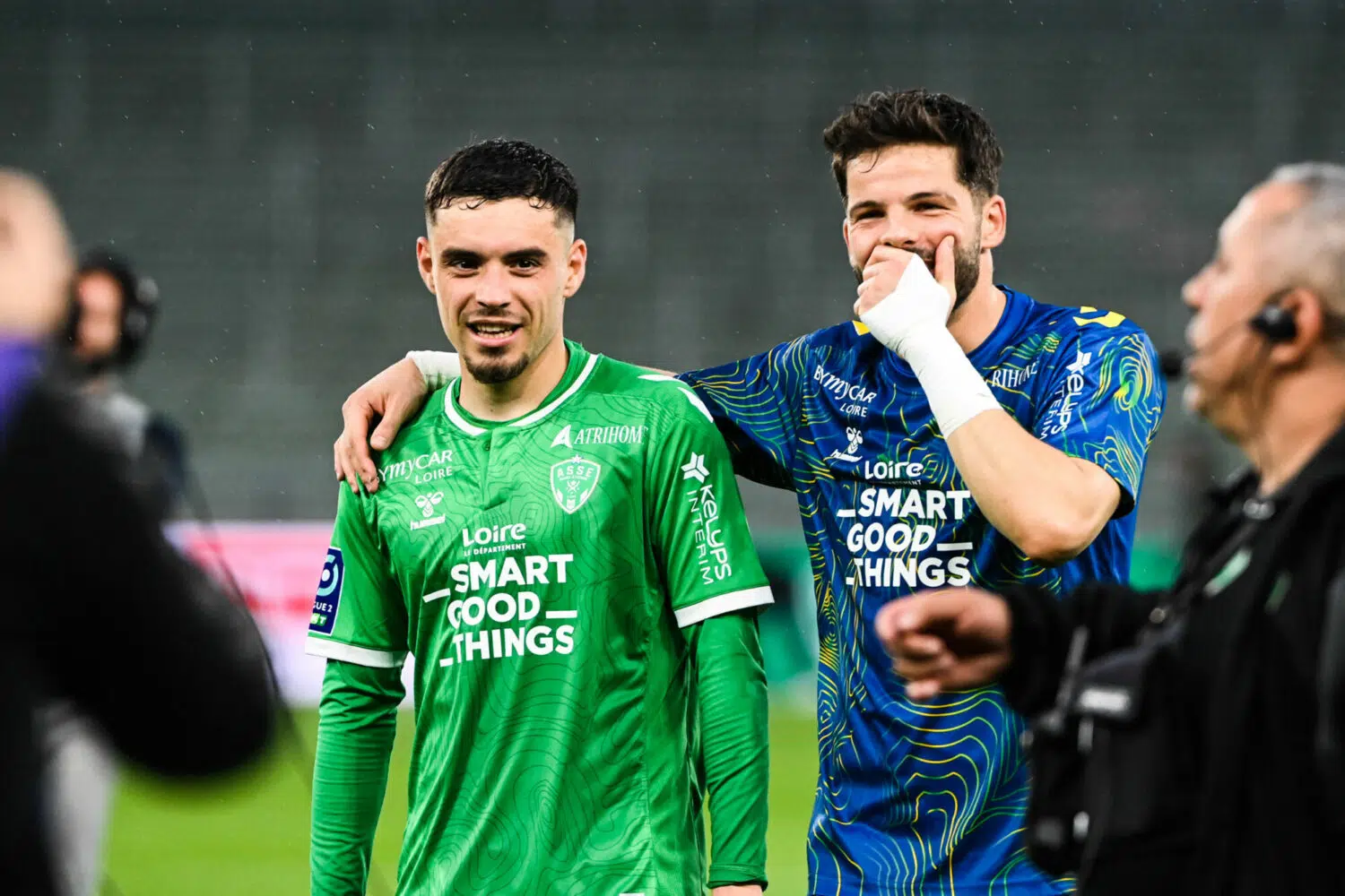 Gautier LARSONNEUR of Saint Etienne and Mathieu Cafaro of Saint Etienne during the Ligue 2 BKT match between Saint Etienne and Quevilly Rouen Metropole at Stade Geoffroy-Guichard on May 20, 2023 in Saint-Etienne, France. (Photo by Daniel Derajinski/Icon Sport)