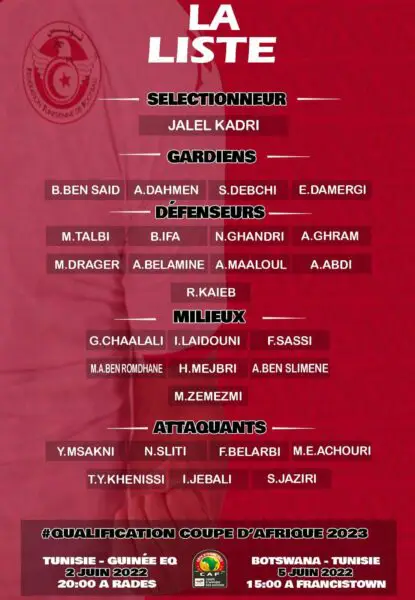 La Tunisie doit disputer deux rencontres dans le cadre des éliminatoires de la coupe d'Afrique des Nations 2023. La première rencontre voit la réception de la Guinée Equatoriale le 2 juin à Rades. La seconde journée se déroule au Botswana le 5 juin. Les aigles du cartage devront donc faire sans leur capitaine et joueur vedette pour les deux premières journées. A noter les absences également d'Ilyess Shkiri l'ex -montpellierain et Dylan Bronn le messin qui a vécu la relégation avec son club.