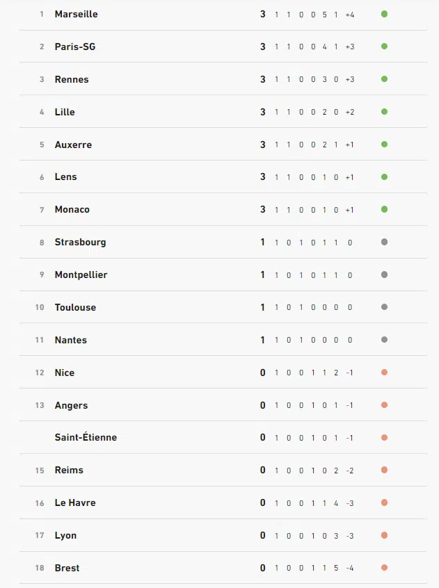 Le classement de ligue 1 à l'issue de cette J1