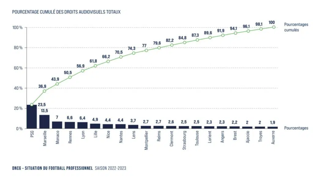 Très rapidement, on constate que le Paris-Saint-Germain a récupéré 23.5 % des droits TV. Laissant les trois quarts du gâteaux à l'ensemble des autres clubs français. L'ASSE n'apparait pas sur ce graphique étant donné que les Verts évoluaient en Ligue 2 (2022-2023).