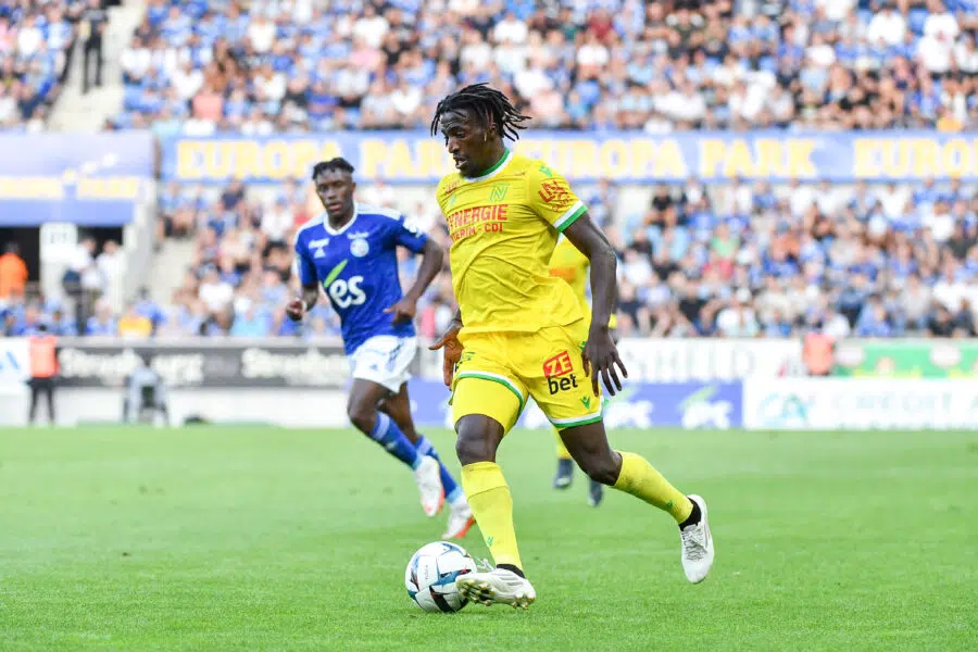 Kader BAMBA of Nantes and Jeanricner BELLEGARDE of Racing Club de Strabourg during the Ligue 1 match between Strasbourg and Nantes at Stade de la Meinau on August 31, 2022 in Strasbourg, France. (Photo by Franco Arland/Icon Sport)