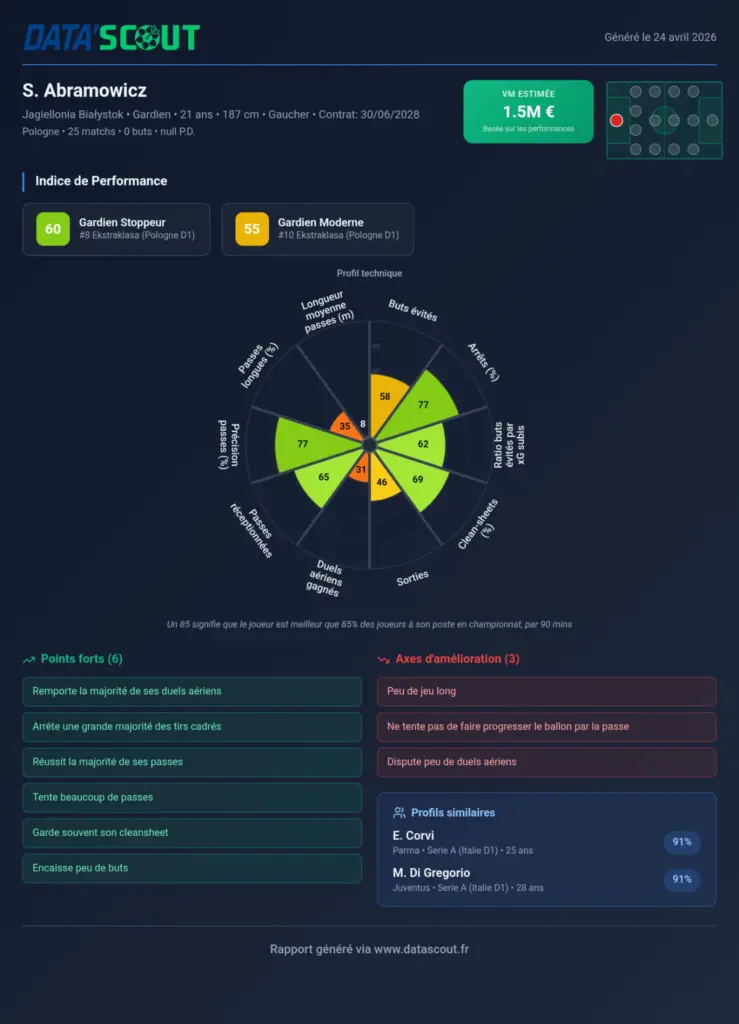 Né le 9 juin 2004 à Varsovie, Abramowicz est un gardien de 21 ans, 1m89, pied gauche — un profil de plus en plus rare et recherché. Titulaire à Jagiellonia Białystok depuis deux saisons, il s'apprête à disputer son 100e match avec le club de Podlasie. International polonais U21 (4 sélections), il a engrangé 18 apparitions en Conference League cette saison — une exposition européenne précieuse pour un joueur de son âge.