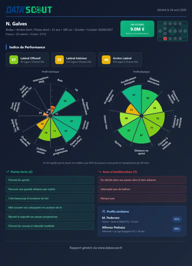 Ses axes d'amélioration existent — peu d'interceptions, du déchet dans le tiers adverse, peu de buts — mais ils sont inhérents à son profil. Galves est un latéral offensif pur, pas un défenseur bas bloc. Ce qu'on lui demande, c'est d'alimenter le jeu vers l'avant, et là-dessus, il est parmi les tout meilleurs de L2.