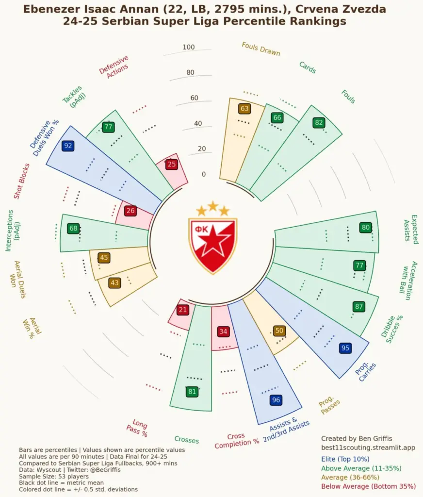 Les données issues de l’analyse comparative des défenseurs de Super Liga serbe sont sans appel : Annan fait partie des meilleurs à son poste dans de nombreux domaines :