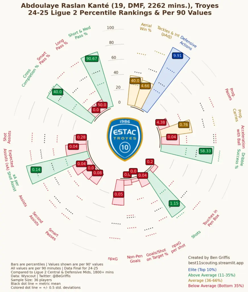 Le graphique data de Kanté laisse apparaître des points forts et des axes d'améliorations tres marqués dans son jeu. La qualité qui ressort le plus chez le milieu de terrain, c’est bien sa capacité à défendre. Auteur de 9.91 actions défensives par match la saison dernière, cela le place parmi l’élite des milieux de ligue 2.